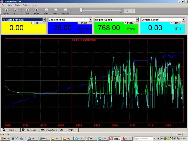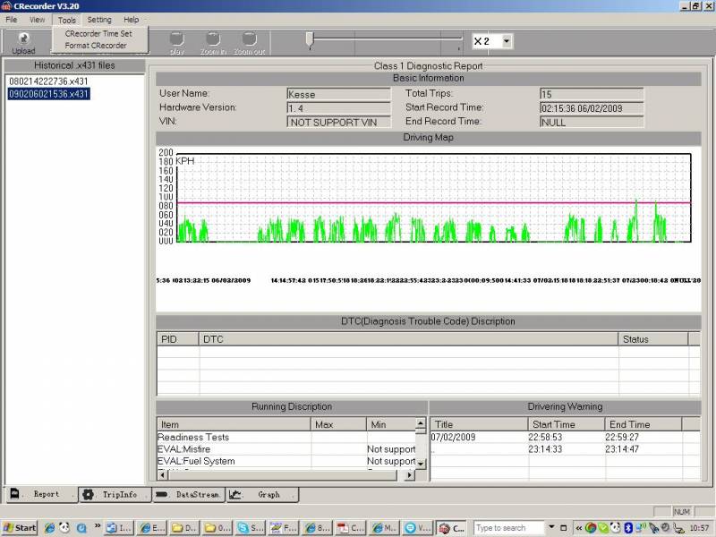 OLULINE pisiasi veel: kuigi järjekordse automootori diagnoosimisel kirjutatakse eelmine salvestus üle. On siiski soovitav alati peale andmete arvutisse kopeerimist kustutada eelmine salvestus ära. SELLEKS ülevalt menüüribast avada Tools, sealt edasi Format CRecorder. Sama menüüriba all on veel kellaaja seadistamine. See on vajalik, et Crecorderi ja arvuti kellaaeg oleksid samad.